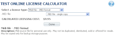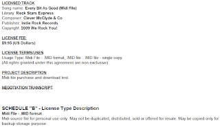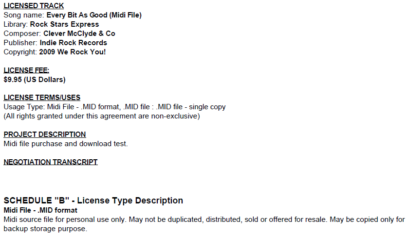 In this example there are now three songs with the same name, the first, “Every Bit As Good” is the audio file version, the second, “Every Bit As Good (Midi File)”, is the Midi file version, followd by the Sheet Music version. When the Play button is clicked, it can open on a demo page with short sample or download disabled version, to give buyers an idea of the format they’ll be purchasing. In the live demo store, the midi file ‘Play’ button links to this preview page on my box.net account. If you wish to leave the “Play” (preview) button blank, you can leave the track’s Preview field URL link blank on your songs data spreadsheet and then import. This will leave the Play button blank. 4. When the midi file is being purchased, it will appear like this in your store: The track item description (inside the green box) gives the details about this specific Midi file item. The description inside the red box is the license type description which you entered for this license on the Licensing Profile page. The $9.95 price shown at bottom is the price you entered on the License Matrix page for the Midi files license type.5. After the Midi file item has been purchased, it will appear on your Licenses Sold page like this: